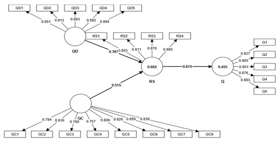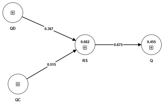 Thirdly, the coefficient of determination (R2), also known as the R-squared value, shows how much of the variation in the endogenous latent variables can be accounted for by the influence of one or more exogenous latent variables. The R2 shows the percentage of variance that the endogenous construct explains. It shows how effectively the model accounts for the data [45]. Higher values of R2 indicate a greater ability to explain occurrences. R2 ranges from 0 to 1. Strong, moderate, and weak R2 values are 0.75, 0.50, and 0.25, respectively [45]. The proposed model explains 45.5 percent of QoL and 68.2 percent of RS, respectively, with an R2 of 0.455 and 0.682, respectively. It is clear from the data in Table 4 and Figure 5 that the RS and Q’s R2 values are moderate. As a result, the PLS algorithm’s output demonstrates that the structure model adequately accounts for the allowed variation level of RS and Q.