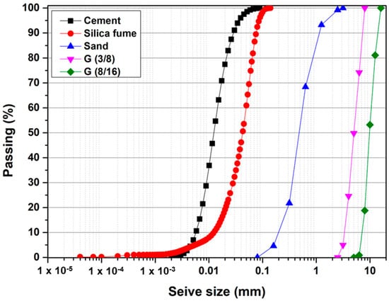 The particle size analysis of the materials used for the confection of HPFRC is presented in Figure 1.