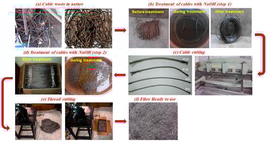 The utilization of recycled fibers offers a valuable opportunity to minimize environmental impact and reduce waste disposal in landfills. Extensive studies have shown the feasibility and economic viability of incorporating different types of fibers recovered from waste sources in the production of reinforced concrete [,,]. Wire ropes, consisting of high carbon steel strands and wires, are subject to various deterioration mechanisms, such as corrosion and inter-wire friction caused by fatigue [,]. While it is crucial to understand the stress behavior of individual wires, predicting the behavior of the cable as a whole requires taking into account the elevated stress resistance exhibited by the insulated wire that is embedded within the cable [].
