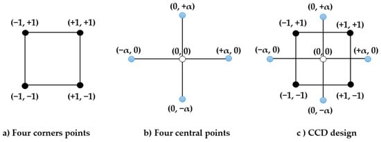where k is the number of independent variables, 2k are the factorial points, 2k is the axial points, and c is the number of experiments at the central point []. The model used to predict the response and give its relationship with the independent variables is represented by the second-order polynomial Equation (2) [,,,]: