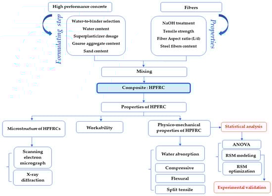 Among the most effective solutions for improving the performance of high-performance concrete is the incorporation of steel fibers, which have been extensively proven to deliver remarkable improvements in various properties, such as compressive and flexural strength, toughness, ductility, and crack resistance [,,]. Furthermore, steel fibers can be utilized to prevent reinforcement congestion, reduce implementation costs, and contribute to the sustainable use of resources [,].