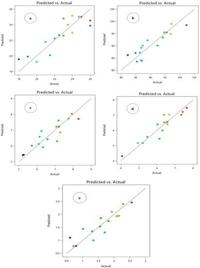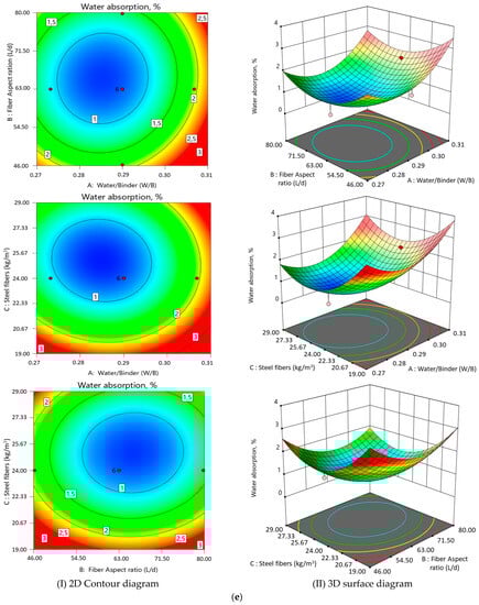 According to the probability distribution of the experimental values depending on the predicted values shown in Figure 6a–e, it can be seen that the response clouds are all close to the fit line. This indicates that the developed models correctly predict the physicomechanical properties of HPFRC in terms of the chosen factors. It’s worth mentioning that the probability distribution points, ranging from blue to red, signifies the variation in values from minimum to maximum values as generated by Design Expert software.
