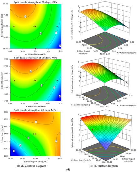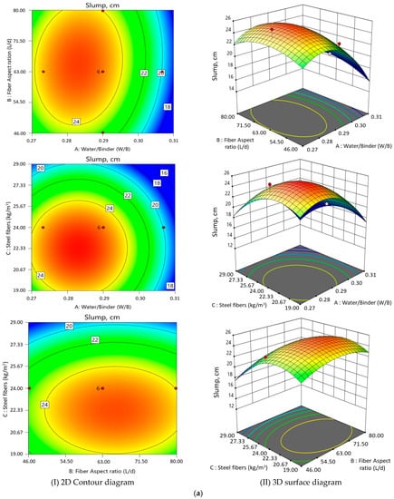 The 2D contour plots and 3D surface curves are used to visualize the response surface and to evaluate the eventual and interactive relationship between the design parameters of the mix and the HPFRC properties. These graphs aim to establish the studied response values and desirable operating conditions and can give a clearer picture of the response surface. Contour plots and surface curves of slump, CS, FS, and WA show that the interactions between W/B, L/d, and SFC exhibit perfect elliptical contours. In contrast, the interactions among the STS factors exhibit elliptical contours that are relatively perfect.