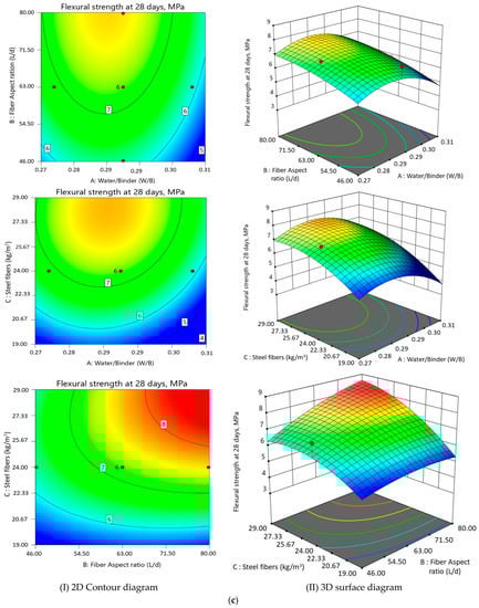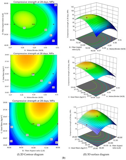 In the generated models, the factors A, B, and C correspond to the water-to-binder ratio (W/B), the aspect ratio (L/d), and the steel fiber content (SFC), respectively. It is important to note that an increase in the values of factor coefficients signifies an increase in the corresponding modeled response, whereas a decrease represented by negative values results in a reduction in the response [].