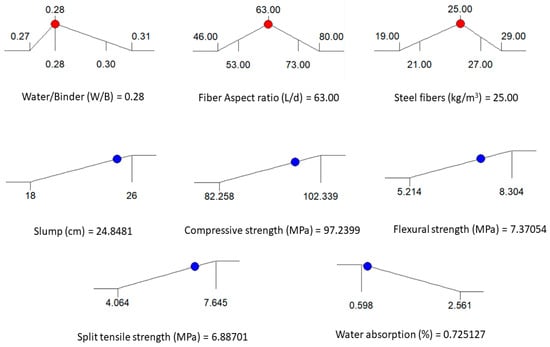 The validation of the optimal design proportions derived from the RSM model involves a comparative analysis of the desirability and the absolute relative percent error with the experimental results, demonstrating minimal values and indicating the accurate prediction of the desired responses. This affirms the reliability and accuracy of the RSM model in providing precise predictions for the specified design proportions. Additionally, the “ramp view diagram for optimization” is a graphical representation that serves to visualize the optimization process and to facilitate the comparison between the different variables’ influence on the desired outcome [,,].