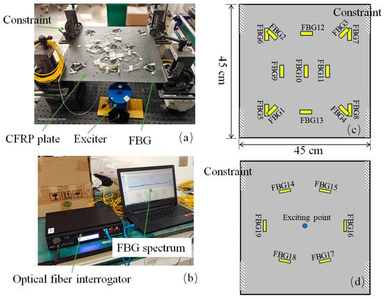 Experimental setup: (a) Physical photo of the testing system; (b) optical fiber interrogator; (c) FBG layout on the upper surface of the CFRP laminate; (d) FBG layout on the bottom surface of the CFRP laminate.