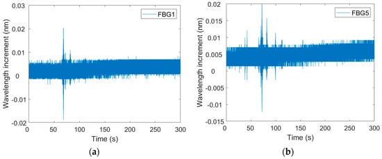 Figure 7 shows the wavelength increment time-domain diagram of each sensor under the condition of periodic rectangular pulse. The FBG signals at different positions have similar waveforms. The wavelength increment of the FBG is vibrating back and forth under the condition of pulse sweep frequency loading. The signal vibration amplitude of the FBG increases at 150 s, which is because the loading magnitude was increased midway through the experiment. Meanwhile, comparing Figure 7a,c–e, the sensor closer to the excitation point has the greater signal amplitude, which shows that the location of the excitation point can be judged by comparing the signal amplitudes of FBG sensors at different positions. Figure 7f shows the signal of the FBG sensor pasted on the bottom surface of the board under the condition of periodic rectangular pulse. It can be seen that the variation phenomenon is the same as that of the FBG sensor pasted on the upper surface, which indicates that the thickness of the CFRP laminates has an ignorable effect on the monitoring signals of FBG sensors.