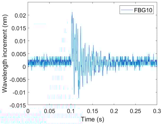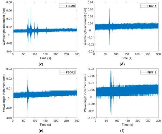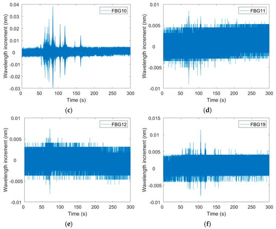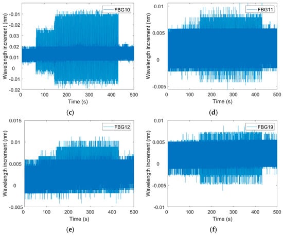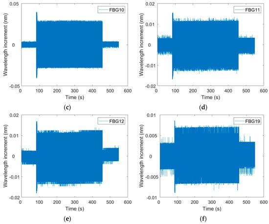Figure 5 shows the wavelength increment time-domain diagram of each sensor under the condition of pulse frequency sweep. The FBG signals at different positions have similar waveforms, which are similar to those of the sinusoidal frequency sweep condition. The wavelength increment of FBG under sinusoidal loading is reciprocating, and there are large oscillations at individual time points, which shows that the FBG sensor can sensitively monitor the application of sinusoidal sweeping load. The large oscillations generated by each sensor at individual time points are due to the fact that the frequency of loading just reaches the natural frequency of the CFRP laminates, and a resonance phenomenon occurs. Due to the small loading magnitude of the pulse sweep, only the signals of FBG10 pasted at the loading point have the largest amplitude, and the signal amplitude differences of the other FBGs are not obvious. Figure 5f shows the signal of the FBG pasted on the bottom surface of the laminates under the condition of sinusoidal frequency sweep. It can be seen that the variation phenomenon is similar to that of the FBG sensor pasted on the upper surface, which shows that the pasted surface does not affect the monitoring effect of the FBG.