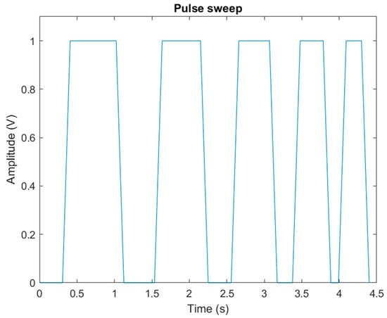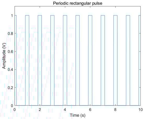 where is the period, and is the width of the rectangle. In this test, the values of the two parameters are 1 s and 0.3 s, respectively. Figure 6 shows a schematic diagram of the periodic rectangular pulse excitation. A burst of 0.3 s excitation was applied every 1 s. Since the excitation time is very short, the action can be approximated to perform an impact on the CFRP laminates every 1 s.