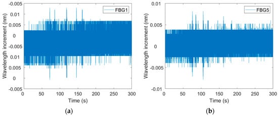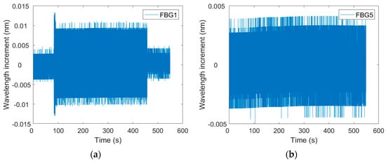 Figure 3 shows the wavelength increment of each FBG sensor in the time domain under the condition of sinusoidal frequency sweep. It can be seen that the FBG signals at different positions have similar trends. The wavelength increment of the FBG under the sinusoidal frequency sweep load is reciprocating, and large oscillations exit at individual time points, which indicates that the FBG sensors can sensitively monitor the sinusoidal frequency sweep load. The large oscillations generated by each sensor at individual time points are due to the fact that the frequency of the loading just reaches the natural frequency of the CFRP laminates, and a resonance phenomenon occurs. It can be seen from Figure 3a,c–e that the sensors closer to the excitation point suffer from greater signal amplitude, which indicates that the location of the excitation point can be judged by comparing the signal amplitudes of FBG sensors at different positions. Comparing Figure 3a,b, it can be seen that although FBG1 and FBG5 were located in the same position, they had different signal amplitudes due to the different axial angles. This indicates that the sensitivity of the FBG sensors to various directions is different, and the direction with the greatest sensitivity is along the axial direction of the FBG sensing element. Figure 3f shows the signal of the FBG sensor pasted on the bottom surface of the laminates under the condition of sinusoidal frequency sweep. The same phenomenon as that of the FBG sensor pasted on the upper surface is observed, which shows that the pasted surface does not affect the monitoring effect of the FBG.