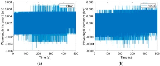 Figure 9 shows the wavelength increment time-domain diagram of each sensor under the condition of 100 Hz sinusoidal constant frequency vibration. The FBG signals at different positions have similar waveforms. It can be seen from Figure 9 that when the load is applied, the wavelength increments of the FBGs reciprocate stably, and the amplitudes of the reciprocating vibration are the same. When the loading is stopped, the FBG signal returns to the initial value, which proves the sensing performance of FBG sensors for long-term monitoring of CFRP laminates.
