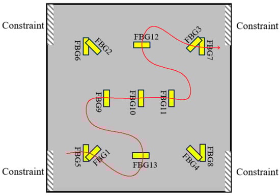 - Since FBG sensors have different sensitivities for different test directions, how to ensure excellent sensing effects in an actual structure should be carefully considered. Since FBG sensors can accurately measure the strain of a CFRP structure, it is a feasible solution to reconstruct the stress–strain field of the CFRP structure through an FBG sensor array.