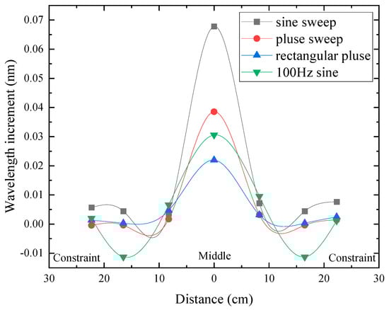 Wavelength increment distribution characteristics: (a) Sine sweep condition; (b) pulse sweep condition; (c) rectangular pulse condition; (d) 100 Hz sine.