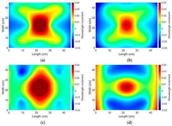 The spatial response characteristics of CFRP laminates were studied through path analysis, which is reasonable for analyzing beam structures. For CFRP square laminates, since the response characteristics in both the length and width directions are important for structural evaluation, it would be more effective to obtain a two-dimensional response distribution feature field. To construct the characteristic field of response distribution, a dangerous moment (i.e., the moment with the maximum wavelength increment) was selected in each working condition, and MATLAB was used to perform surface interpolation on the response value measured by the FBG sensors at that moment. Figure 12 shows the distribution characteristic field of the wavelength increment of the FBG sensors on the CFRP laminates under various working conditions.