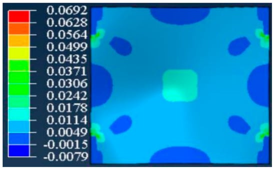 To verify the potential of the FBG sensor to reconstruct the stress–strain field of CFRP laminates, a finite element analysis (FEA) was established based on the commercial software ABAQUS 2022. Figure 13 shows the stress field under a point load in the laminates. Interestingly, the stress field generated by FEA follows the same pattern as the response characteristic field in Figure 12, which verifies the reliability of the FBG sensor to reconstruct the stress field of CFRP laminates. Due to the diversity of CFRP laminates induced by the complicated fabrication, the quantitative analysis between the simulated results and the testing results has not been conducted. The dynamic performance identification of the practical CFRP laminates can be realized by making full use of the FBG sensing technology.