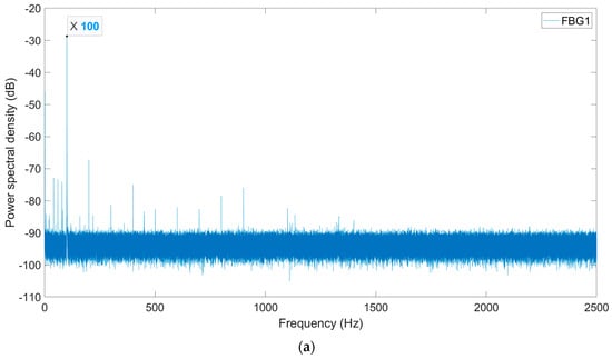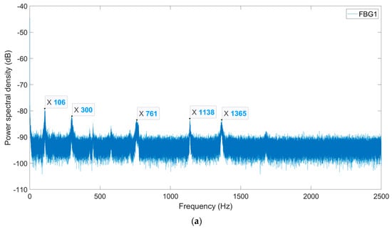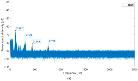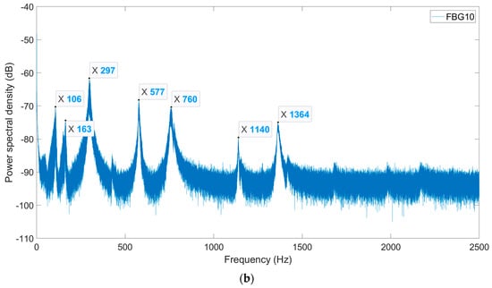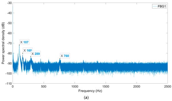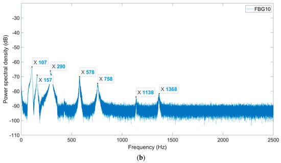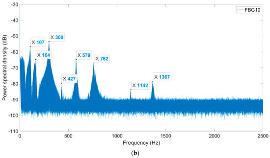 where is the frequency-domain distribution of the signal, is the time-domain distribution of the signal, and is the power spectrum estimation of the signal. Figure 14, Figure 15, Figure 16 and Figure 17 show the power spectral density of FBG1 and FBG10 under four loading conditions.
