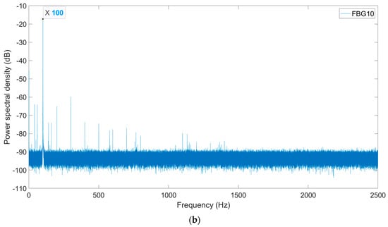 PSD under 100 Hz sine fixed frequency vibration condition: (a) FBG1; (b) FBG10.