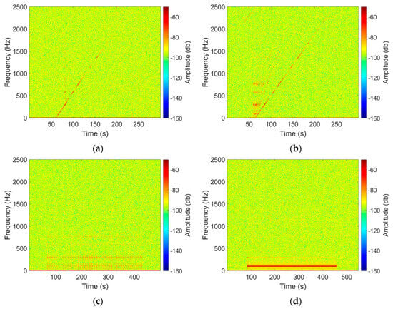 Short-time Fourier transform diagram of FBG signals: (a) Sine sweep condition; (b) pulse sweep condition; (c) rectangular pulse condition; (d) 100 Hz sine fixed frequency vibration condition.