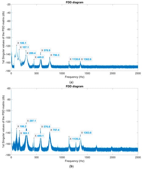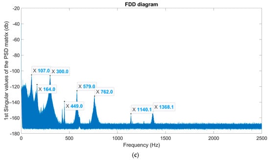where is a unitary matrix containing complex vectors of singular values. The superscript H represents the calculation of the conjugate transpose of the matrix. is a diagonal matrix containing m scalar singular values, and each singular value corresponds to the power spectrum of a single-degree-of-freedom system; m is the number of output response measuring points. The scalar diagonal matrix sequence peaks correspond to the modal frequencies of the structure [,].