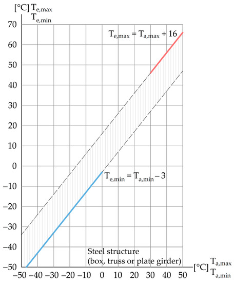 Temperature changes in the bridge superstructure (ΔTN,con and ΔTN,exp) are determined according to the standard EN 1991-1-5 [28], as well as the national annex SRPS EN 1991-1-5/NA [29]. For simplified calculations, temperature changes in the bridge superstructure equal to ΔTN,exp = ΔTN,con = ±35 °C can be adopted according to [25]. Figure 2 shows the relation between the components of the minimum/maximum shade air temperature (Ta,min, Ta,max) and the minimum/maximum uniform bridge temperature (Te,min, Te,max) for steel (truss) railway bridges.