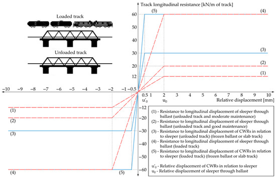 The track longitudinal resistance defines the connection between the track and the bridge structure. Figure 3 shows diagrams of track longitudinal resistance as a function of the relative displacement of CWRs in relation to the sleeper, i.e., the relative displacement of the sleeper through the ballast, both for unloaded and loaded tracks. The shape of the diagrams is bilinear, where the track longitudinal resistance increases up to the limit value of the relative displacement, after which it is kept constant [23].