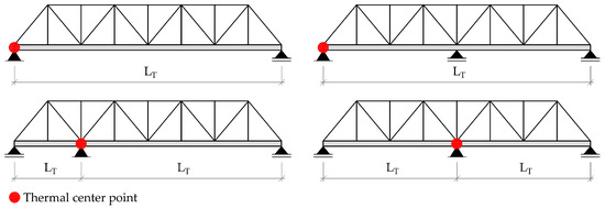 The bridge expansion length (LT) represents the distance between the thermal center point and the end of the bridge structure (Figure 4). The position of the thermal center point depends on the position and type of bridge supports [23]. The maximum expansion length of steel railway bridges with CWRs without the rail expansion device (which should be checked in TBI analysis) is 60 m [23]. Consequently, the maximum length of the bridge structure with fixed support in the middle of the structure can be up to 120 m.