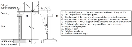 The longitudinal stiffness of the bridge support (K) considers the combined stiffness of the bearing, pier, foundation, and foundation soil (Figure 5). In general, only the longitudinal stiffness of the fixed bridge support should be considered. The longitudinal stiffness of the bridge support is determined based on the following formulas [23]:
