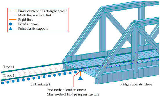 To calculate additional temperature stresses in CWRs, longitudinal displacements of the track and bridge, the size of rail gap due to rail cracking, as well as the relevant compressive force for checking the track stability, numerical models for TBI analysis due to thermal actions have been developed using the finite element-based software Midas Civil 2022 (v1.2) [39]. The numerical models include (Figure 6) [40]: