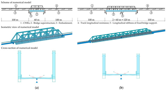 Numerical models for TBI analysis due to thermal actions: (a) Simply supported truss bridge with expansion length of 60 m and (b) Continuous truss bridge with expansion lengths of 2 × 60 m.