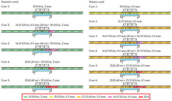 Cases of track longitudinal resistance in summer and winter conditions for continuous truss bridge with expansion lengths of 2 × 60 m.
