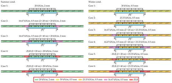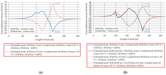 On the other hand, in the case of continuous truss bridges with expansion lengths of 2 × 60 m, the maximum total additional compressive stresses in summer conditions exceeded the permissible additional compressive stresses in CWRs. Consequently, a reduction of additional temperature stresses in CWRs was required. This reduction was achieved by applying the ZLR reduced resistances of the unloaded track (see Table 11).