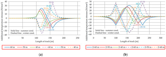 Variation of the additional temperature stresses in summer and winter conditions depending on the bridge expansion length are depicted in Figure 13.