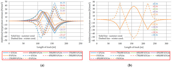 Table 6 shows the maximum values of additional temperature stresses depending on the track longitudinal resistance, along with the percentage reduction of the additional temperature stresses as the track longitudinal resistance decreases.
