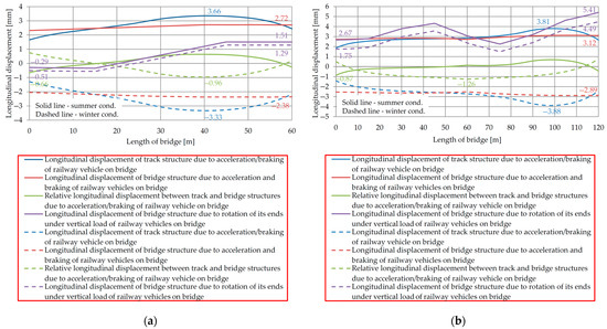 Figure 16 shows the diagrams of the longitudinal displacements of the track and bridge structures in summer and winter conditions, including the vertical load and acceleration/braking of the railway vehicle.