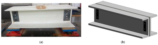 In this study, PFRP profiles were obtained from Kangte Composite Material Co., Ltd., Nanjing, China. The PFRPs had dimensions of 152.4 mm × 228.6 mm × 11.11 mm (width × height × wall thickness) and were made of glass fiber-reinforced unsaturated resin. Glass fiber with a fiber density of 4.8 g/m and vinyl resin were used as the raw materials. Uni-directional fibers with a volume ratio of 55% were employed. To decrease the cost of PFRP, 20% of the weight of the matrix was added. It should be noted that a 10 mm radius was present in each corner of the U-shaped PFRP. The hand-layered core plates were made of glass fiber-reinforced vinyl resin with a bidirectional woven fiber fabric, having a fiber density of 4.8 g/m. Steel plates with a thickness of 5 mm and a yield strength of 460 MPa were used, with steel bolts fixed in the flanges of the FRP girders and tightened with nuts and washers. The steel bolts were tightened to a preset torque of 25 N∙m using a torque wrench to provide a semi-fixed boundary condition. Steel bolts were all high-strength M8.8 grade (800 MPa ultimate strength and 640 MPa yielding strength) and all of them had a shank diameter of 12 mm. Steel washers with dimensions of 30 mm (outer diameter), 12.5 mm (inner diameter), and 1.0 mm (thickness) were used to disperse the stress caused by the steel bolts.