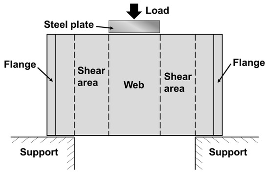 According to the composite action theory of FRP–concrete hybrid sections, FRP and concrete work together to resist shear stress. The concrete slabs used in this study were relatively larger than normal composite beams; thus, the contribution of concrete could not be ignored [43,45,46]. Herein, an analytical method that considers concrete and FRP webs jointly is proposed: