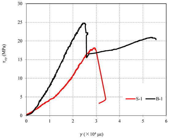Shear stress–shear strain curves of specimens S-1 and B-1.