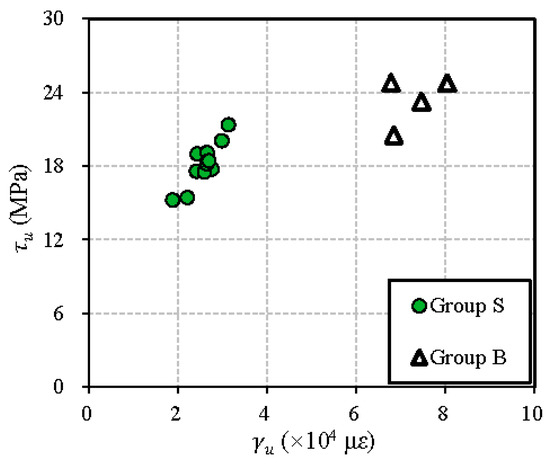 The results of the direct shear test indicate that the average shear strength of the pultruded FRP profiles was 18.21 MPa, which was 1/7.5 of the steel’s 235 MPa as expected. Furthermore, the addition of bolts to the post-molded profiles in group B-1 to B-4 prevented interface separation and increased the average shear stress to 23.3 MPa, a 28% increase from the pultrusion method. It should be noted that 23.3 MPa is a low shear strength compare with many commercial products available today, but the improvement of the shear strength is notable, which means that the proposed manufactory method can be used to some extent. Lastly, the – curves of pultruded specimens showed a linear increase until brittle fracture, while the post-molded specimens showed significantly improved ductility as the pultruded part fractured and the remaining parts continued to hold the load, resulting in a higher ultimate strain of 2.82 times that of pultrusion. The ultimate stress and strain can be seen in the scatter diagram of Figure 6.