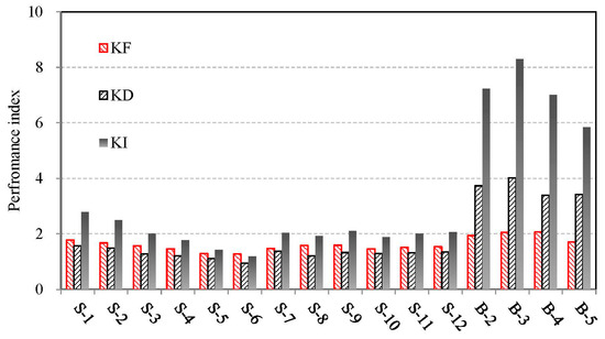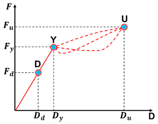 There was study on how to define the ductility index of the curves, as shown in Figure 5. According to Ye et al. [32] and Feng et al. [43], quantitative analysis of the safety redundancy index for FRP materials was proposed in a similar way to take the pseudo-ductility into consideration. The theory defined a design point D and a structural member resistance curve (load–deformation curve, Figure 7). After determining this point, the following indicators can be calculated: capacity redundancy index ()—the ratio of ultimate bearing capacity () to that of the design point (), Equation (1); deformation redundancy index ()—the ratio of ultimate deformation () to that of the design point (), Equation (2); general index ()—the product of the two above indicators, Equation (3). In this study, the design point was determined as (12 MPa, 2 × 104 με); the three indices are shown in Table 1 and Figure 8.