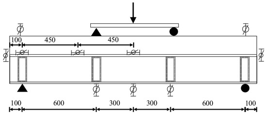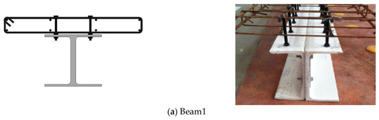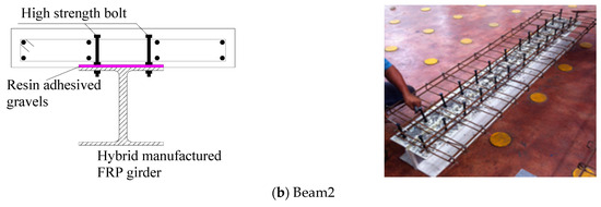 Two large-scale tests on FRP–concrete beams with small shear span ratios (as low as 1.5) were conducted to evaluate the shear performance of the proposed built FRP webs. Beam_1 had steel bolts along the interface, while Beam_2 had steel bolts together with epoxy bonded gravels along the interface. Hence, it was expected that Beam_2 had less interfacial slip, i.e., more composite action between FRP and concrete. To avoid buckling of the FRP flange plates and improve their local bearing capacity and overall flexural rigidity, concrete slabs were cast above the FRP beams (as illustrated in Figure 9 and Figure 10). The longitudinal reinforcement and stirrups were made of 10 mm diameter and 6 mm ribbed bars, respectively. The bolts had a diameter of 12 mm and a high strength rating of 8.8. The adhesive used was a 1:1 ratio of epoxy resin, and the perforated FRP connectors were connected to the post-molded FRP girder using the aforementioned adhesive and 6 mm diameter bolts with a yield strength of 400 MPa. In this study, the design strength grade of concrete had a target strength of 40 MPa. The mixture ratio of the C40 concrete was 1.00:0.46:1.24:2.84 (cement, water, sand, and gravel, respectively) in mass. Per Chinese code GB 50010-2010 [44], 150 mm × 150 mm × 150 mm cubes were cast during the pouring process of the tested beams. The average compressive strength of concrete cubes was measured to be 44.1 MPa (CoV = 0.15) under standard curing conditions (temperature at 20 ± 2 °C, relative humidity ≥ 95%) after 28 days.
