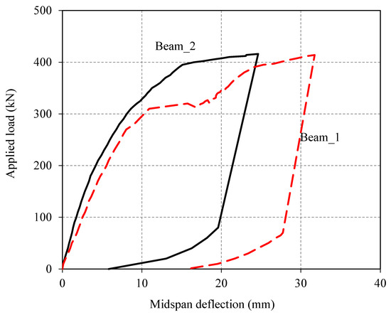 - The elastic stage (0–0.2 ): the concrete slab cracked at about 0.15 , albeit without really affecting the overall flexural stiffness, see Figure 11. The cracks formed at the mid-span of the beam at the bottom of RC slab, and then propagated to the upper vertical direction), see Figure 12 and Figure 13. Interestingly, Beam_2 had a higher rigidity, which was attributed to the improved shear connection compared with Beam_1.