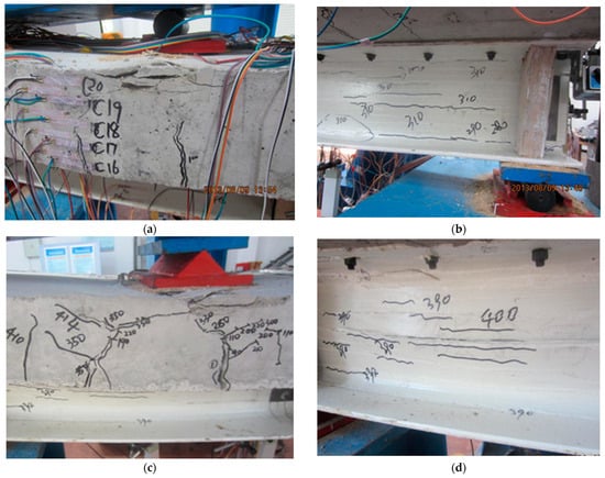 Figure 13. Failure modes for FRP–concrete composite beams: (a) load point in Beam_1; (b) FRP web in shear span of Beam_1; (c) load point in Beam_2; (d) FRP web in shear span of Beam_2. - (ii)