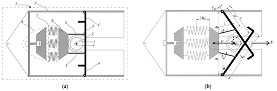 When a relative displacement is applied between the transmission shaft (2) and the casing (9), the device reacts with a force opposite to the direction of the displacement (as shown in Figure 1b). Part of the deformation is concentrated in the spring system ( in Figure 1b), while the remainder is due to the rotation of the clamp, ring, and connecting rod systems. Under the external load , the cylindrical shaft (2) transmits the force to the ring system (3), which then transfers it to both sets of clamps (4). The clamps transmit the force to the connecting rods (5), and the rods, in turn, pass it on to the interconnection element (6), ultimately transmitting the force to the spring system (7) fixed to the casing (9) through the pretension mechanism (8).