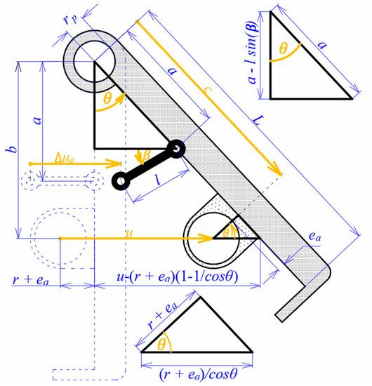Figure 1b shows a schematic model of the improved device in a deformed state with its relevant geometric variables for design purposes. However, for a better understanding of the geometric relationships and how they are linked to the local degrees of freedom (, , , ) and global degree of freedom () in the deformed state, a more detailed representation of that state is shown in Figure 2. This figure only shows one of the two sets of clamps and the respective ring system in contact with them because this is sufficient to describe the kinematic relationships.