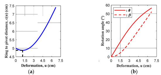 Graphical representation of kinematic relationships as functions of the displacement . (a) Longitudinal distance from ring to clamp pivot, ; (b) local degrees of freedom, and .