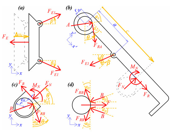 One way to linearize the nonlinear system given by Equations (13)–(19) is by eliminating the unknown variables and from the formulation. This can be done by changing the force vectors in polar coordinates (, ) and (, ) to their Cartesian equivalents (, ) and (, ) according to the local reference axes shown in Figure 4a–d. This process is shown graphically in Figure 5a–c.