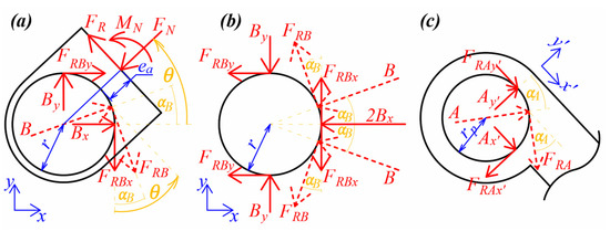 FBD with forces in polar coordinates, arrows in solid lines, versus Cartesian coordinates, arrows in dashed lines. (a) Ring system, (b) transmission shaft, (c) clamp’s hinged end. In orange the DOFs are indicated, in blue the dimensions and in red the forces and moments.