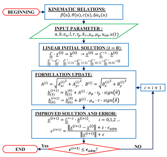 The term ε in Equation (28) seeks to avoid a potential uncertainty of the calculated error when the answer x(i) approaches the null vector. Figure 6 shows a flowchart of the previously presented nonlinear system resolution algorithm from Equations (21) and (28) that allows for obtaining the response of the proposed dissipation device given a displacement forcing with strain velocity .