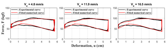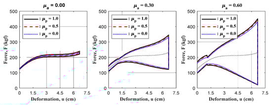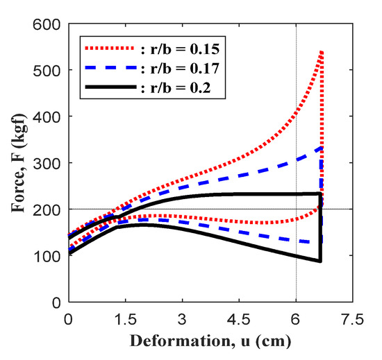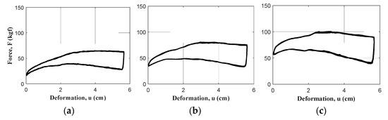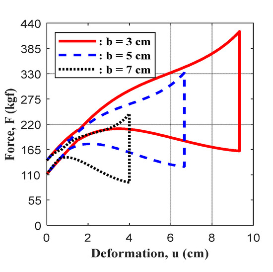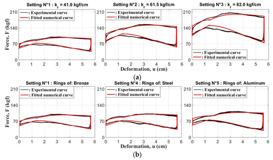 Figure 10 shows the effect of the variables and on the response of the device in a complete load–unload cycle. It can be seen that the higher the value of , the greater the force at the start of the device’s load branch. It is also observed that the higher the value of the greater the tangent stiffness in the loading curve, the lower said stiffness in the unloading curve, and the greater the energy dissipated in a complete deformation cycle.