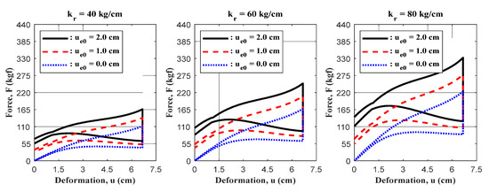 The influence of these variables was studied through a parametric analysis. These variables are the stiffness of the set of springs, , and the pre-deformation of the set of springs, . The analysis procedure was similar to that indicated in the previous section. For the variable , the values 40, 60, and 80 kgf/cm were considered; for the variable , the values used were 0.0, 2.5, and 5.0 cm. The other design variables were kept constant, considering the following values: = 5 cm, = 0.3, and = 0.
